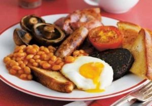 <週末で時間に余裕があれば、盛りだくさんのイングリッシュ・ブレックファストを好んで食べます。卵、ベーコン、ソーセージ、焼いた(炒めた)パン、煮豆、トマト、マッシュルーム、そしてブラックプディング>
