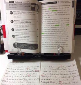 次にテキストの特定箇所を区切って本格的なシャドウイングをします。一切テキストを見ずに、音声だけを聴いてするものです。初めはそんなことができるのかと思いましたが、繰り返してやっているとできるようになります。